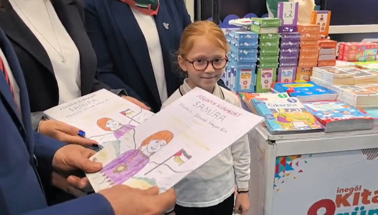 Bursa'da ilkokul öğrencisi Aslıhan Karakurt (9), İsrail'in Gazze katliamından etkilenerek kaleme aldığı 'SAMİRA Filistin'e Dönmek İsteyen Kız' isimli kitabını İnegöl Kitap Fuarı'nda satışa sundu. Aslıhan, resimlerini de çizip boyadığı 24 sayfalık hikaye kitabının satışından elde edeceği geliri, Filistin'e bağışlayacak.