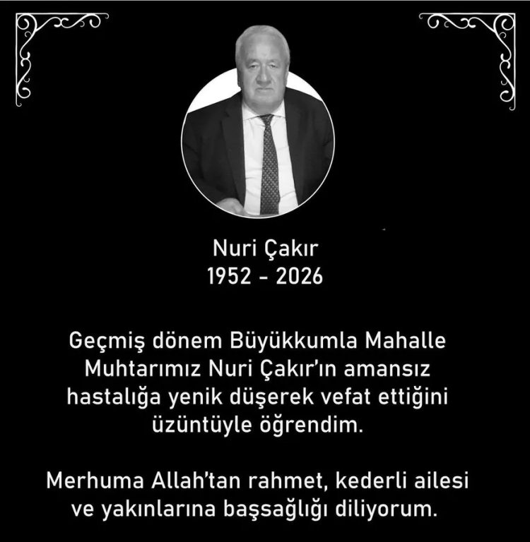 Başkan Deviren yaptığı paylaşımda, "Geçmiş dönem Büyükkumla Mahalle Muhtarımız Nuri Çakır'ın vefat ettiğini üzüntüyle öğrendim. Merhuma Allah'tan rahmet, kederli ailesi ve yakınlarına başsağlığı diliyorum" ifadelerine yer verdi.