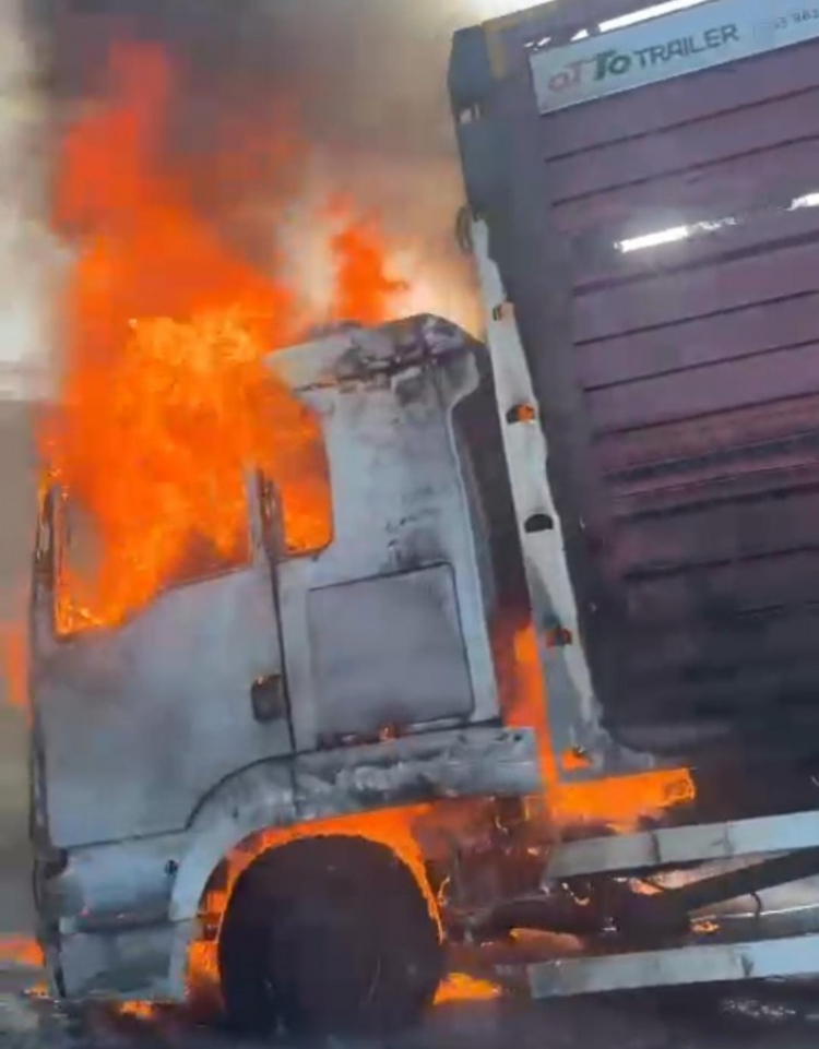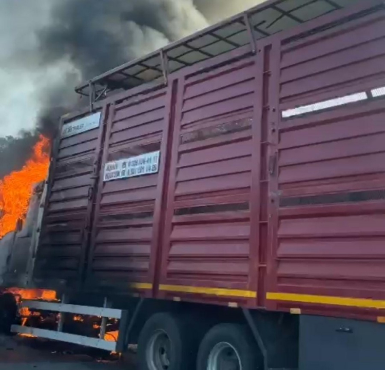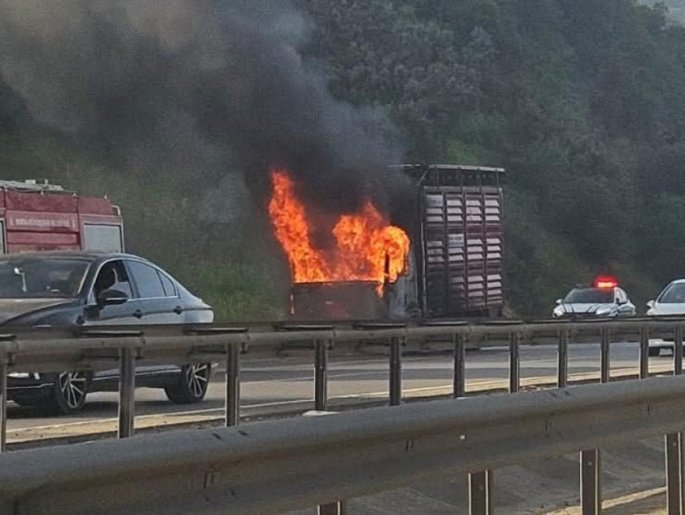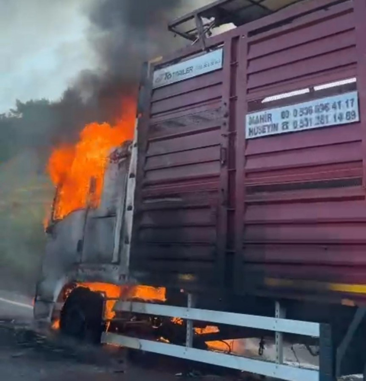 Kısa sürede büyüyen alevler, kamyonu sararken polis ekipleri trafikte güvenlik önlemi aldı.