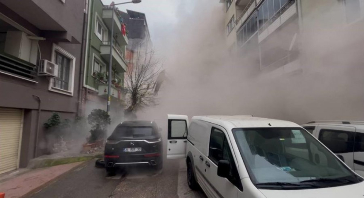 İş makinesinin binanın 3'üncü katına darbe vurmasıyla, geri kalan katları da yerle bir oldu. Sokak toz bulutuyla kaplanırken, vatandaşlar ilk defa böyle bir yıkım gördüğünü söyledi.