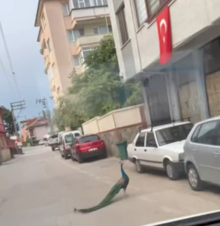 Osmangazi ilçesi Hamitler Mahallesi'nde sokak aralarında ilerleyen bir sürücü, yol ortasında dolaşan tavus kuşunu fark edince aracını yavaşlattı.