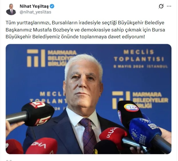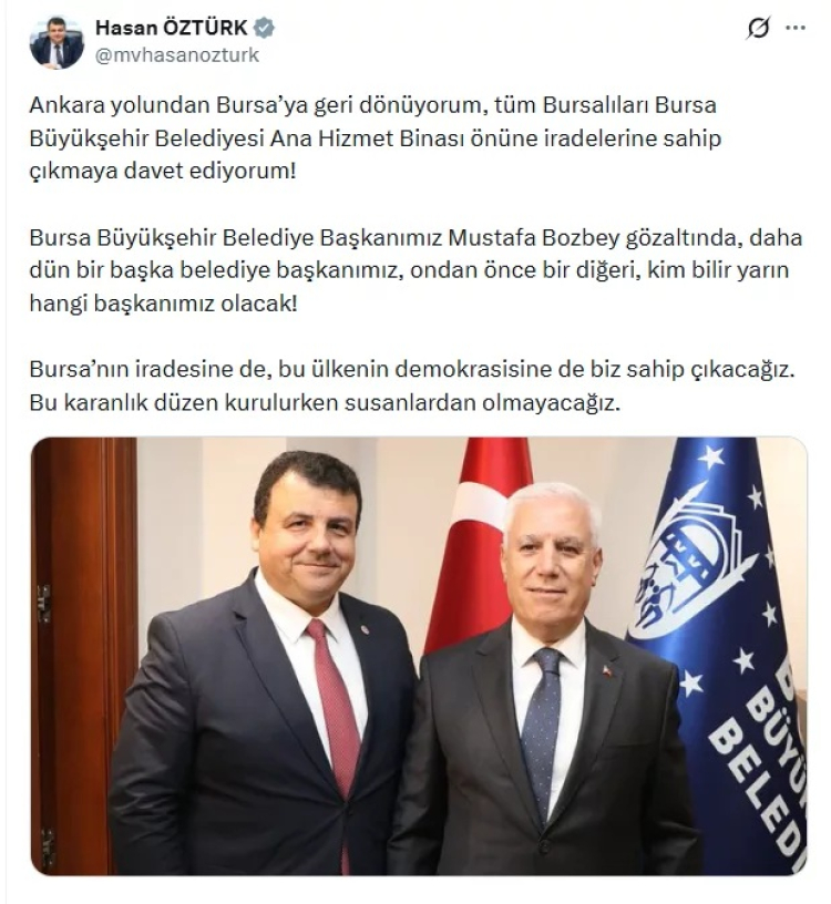 Tüm yurttaşlarımızı, Bursalıların iradesiyle seçtiği Büyükşehir Belediye Başkanımız Mustafa Bozbey'e ve demokrasiye sahip çıkmak için Bursa Büyükşehir Belediyemiz önünde toplanmaya davet ediyorum!