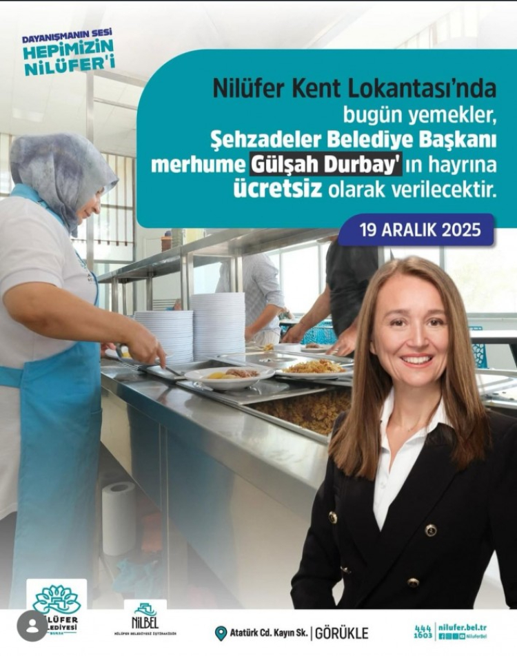 Nilüfer Belediyesi, yaptığı açıklamada "Nilüfer Kent Lokantası'nda bugün yemekler, Şehzadeler Belediye Başkanı merhume Gülşah Durbay'ın hayrına ücretsiz olarak verilecektir" ifadeleriyle duyurdu. Nilüfer Kent Lokantası, bugün 13:00-17:00 arası ücretsiz hizmet verecek.