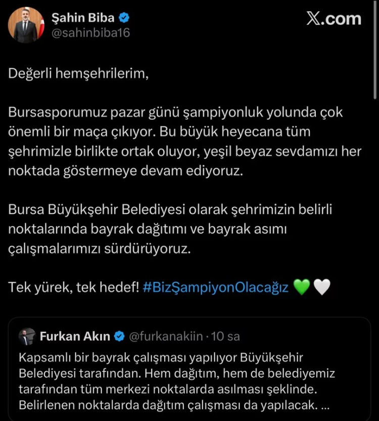 Bursaspor'un şampiyonluk yolunda pazar günü oynayacağı kritik karşılaşma öncesinde Bursa'da heyecan giderek yükseliyor. Bursa Büyükşehir Belediye Başkan Vekili Şahin Biba, önemli karşılaşma öncesi bayrak dağıtımı ve kentin belirli noktalarına bayrak asımı çalışmalarını sürdürdüklerini açıkladı.