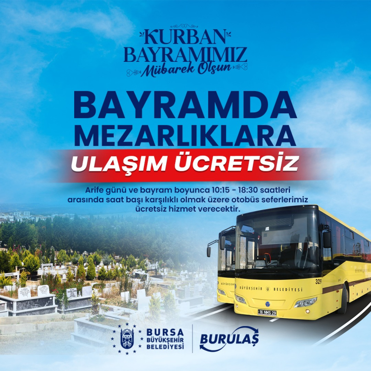 Bursa Büyükşehir Belediyesi, 15-19 Haziran tarihleri arasındaki Kurban Bayramı boyunca kent içi toplu taşıma araçlarının ve Bursaray hatlarının ücretsiz olacağını açıkladı.