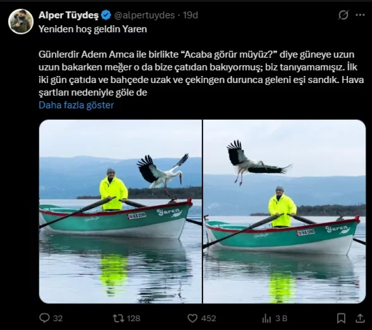 "Yeniden hoş geldin Yaren Günlerdir Adem Amca ile birlikte "Acaba görür müyüz?" diye güneye uzun uzun bakarken meğer o da bize çatıdan bakıyormuş; biz tanıyamamışız. İlk iki gün çatıda ve bahçede uzak ve çekingen durunca geleni eşi sandık. Hava şartları nedeniyle göle de açılamamıştık. Dün Adem Amca'nın kapısının önünde beklemeye başlayınca içimize bir şüphe düştü. Bu sabah buz gibi havaya rağmen şansımızı yeniden denedik... Ve anladık ki gelen Yaren'miş! Merak edenlere, soranlara, bir kuşla baharı bekleyenlere müjdeler olsun. Buluşma 15. yılda da gerçekleşti."