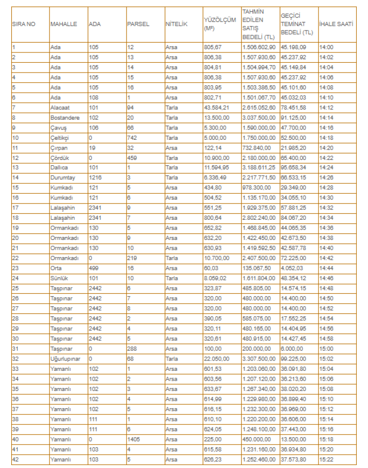 İhale kapsamında 32 arsa ve 10 tarla için satış gerçekleştirilecek.