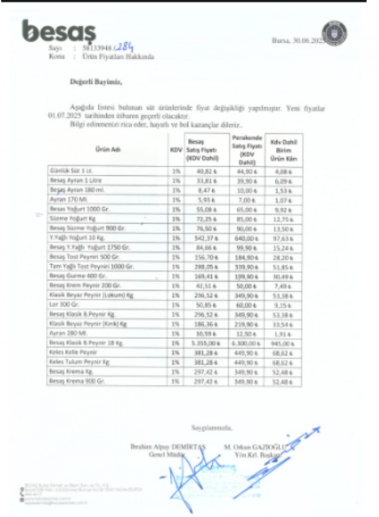 BESAŞ tarafından yapılan açıklamada, süt ve süt ürünlerinde önemli fiyat artışlarına gidildiği duyuruldu. Günlük süt 1 litre 44,90 TL'den satışa sunulurken, ayran, yoğurt ve peynirürünlerinin fiyatları da zamlandı. Özellikle süzme yoğurt, klasik beyaz peynir ve tost peyniri gibi ürünlerde dikkat çekici artışlar göze çarpıyor.