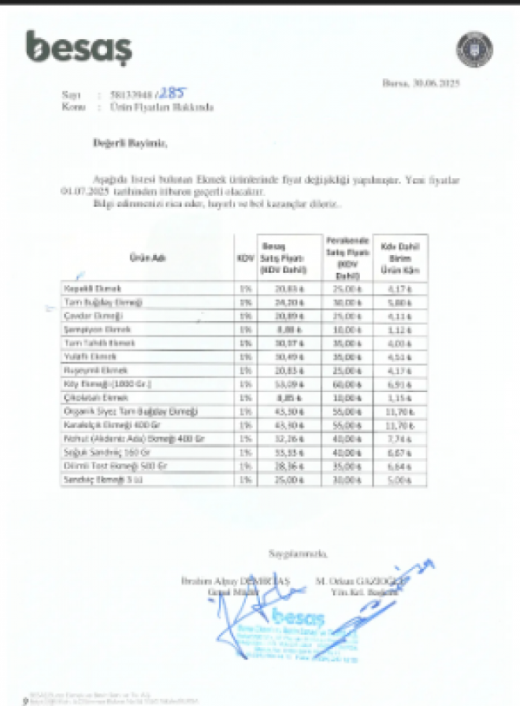 BESAŞ, ekmek ürünlerinde de fiyat düzenlemesine gitti. Tam buğday ekmeği 30 TL, tam tahıllı ve yulaflı ekmekler ise 35 TL olarak fiyatlandırıldı. Köy ekmeği ve organik siyez tam buğday ekmeği 55 TL'ye yükseldi. Ancak, francala ekmek fiyatında herhangi bir değişiklik yapılmadı.