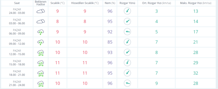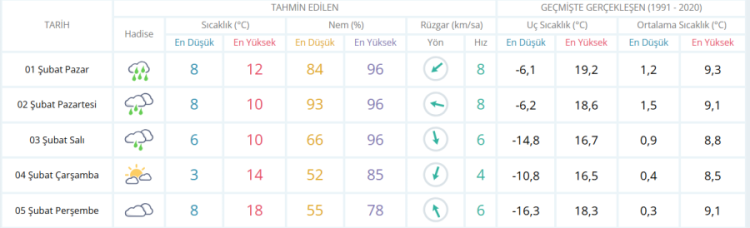 01 Şubat Pazar :Yağış gün boyu etkili. Sıcaklık 8 / 12°C. Nem yüksek (%84-96). Rüzgâr hafif, akşam saatlerinde zaman zaman kuvvetli.