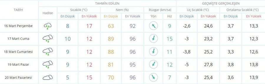 Meteoroloji Genel Müdürlüğü tarafından yapılan son değerlendirmelere göre: Ülkemiz genelinin parçalı ve çok bulutlu yağışlı geçeceği tahmin ediliyor. Genellikle yağmur ve sağanak, Doğu Karadeniz'in iç kesimleri ile Doğu Anadolu'nun kuzeydoğusunun yükseklerinde karla karışık yağmur ve yer yer kar şeklinde olması beklenen yağışların; Kıyı Ege, Batı Akdeniz ile Kahramanmaraş, Malatya, Elazığ ve Diyarbakır çevreleri ile Adıyaman ve Şanlıurfa'nın doğusu, Mardin'in batısı ve Hakkari çevrelerinde yerel kuvvetli olması bekleniyor.