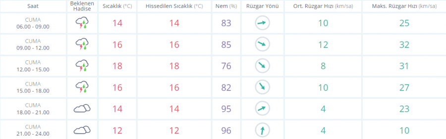 Ülkemiz genelinin parçalı ve çok bulutlu, Marmara, Kuzey ve İç Ege, Akdeniz, İç Anadolu, Karadeniz (Gümüşhane ve Bayburt hariç), Doğu Anadolu'nun doğusu ile Siirt çevrelerinin sağanak ve gök gürültülü sağanak yağışlı geçeceği tahmin ediliyor. Yağışların: Batı ve Orta Karadeniz'in iç kesimleri, Ankara, Konya, Aksaray, Nevşehir, Niğde, Yozgat, Çankırı, Sinop ve Samsun çevreleri ile Antalya'nın iç, Isparta ve Burdur'un güney kesimlerinde yerel olarak kuvvetli olması bekleniyor. Doğu Anadolu'nun güneydoğusunda toz taşınımı görüleceği tahmin ediliyor.
