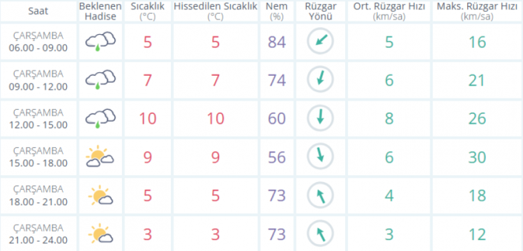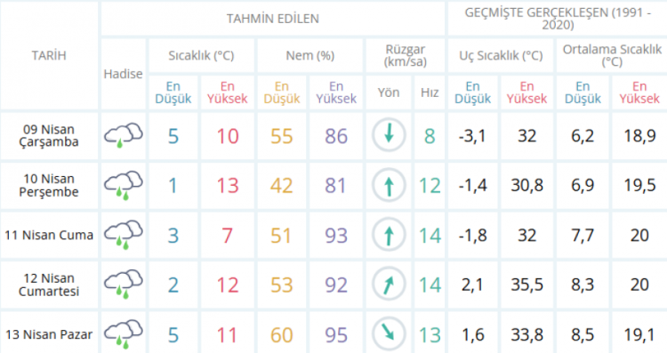 ÇARŞAMBA günü sıcaklık en düşük 5, en yüksek 10 derece hafif yağışlı
