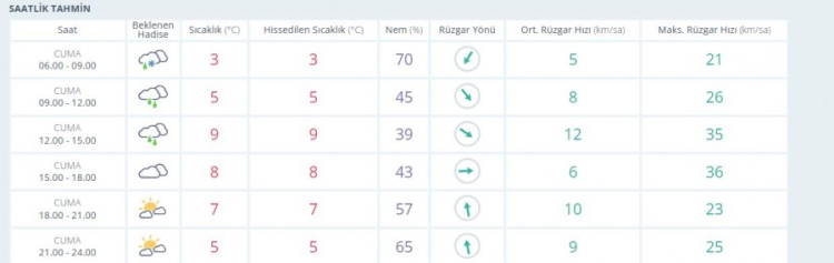 Gün boyunca yer yer kar sağanakları etkili olacak. En yüksek sıcaklık 5°C, en düşük sıcaklık ise -2°C olarak ölçülecek.