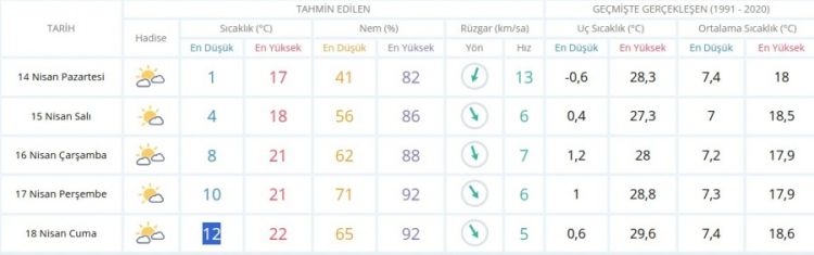 Meteoroloji Genel Müdürlüğü (MGM) tarafından Bursa için yapılan son değerlendirmelere göre 14 Nisan Pazartesi günü ve 5 günlük hava durumu detayları şöyle;