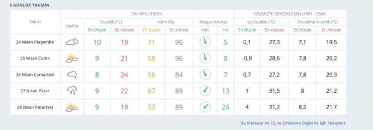 Meteoroloji Genel Müdürlüğü (MGM) tarafından Bursa için yapılan son değerlendirmelere göre 24 Nisan Perşembe günü ve 5 günlük hava durumu detayları şöyle;