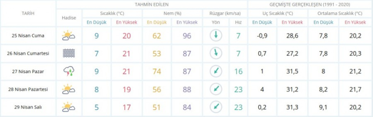 Meteoroloji Genel Müdürlüğü (MGM) tarafından Bursa için yapılan son değerlendirmelere göre 25 Nisan Cuma günü ve 5 günlük hava durumu detayları şöyle;