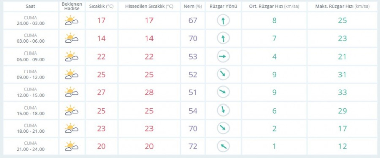 CUMA günü sıcaklık en düşük 14, en yüksek 28 derece parçalı bulutlu