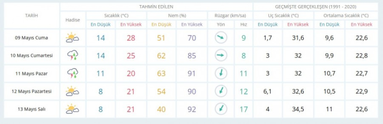 Meteoroloji Genel Müdürlüğü (MGM) tarafından Bursa için yapılan son değerlendirmelere göre 9 Mayıs Cuma günü ve 5 günlük hava durumu detayları şöyle;