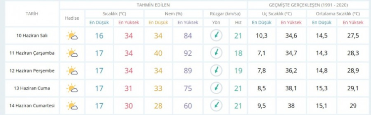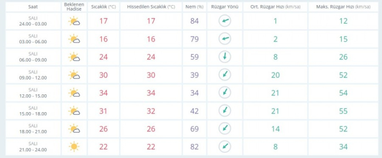 ÇARŞAMBA günü sıcaklık en düşük 17 en yüksek 34 az bulutlu
