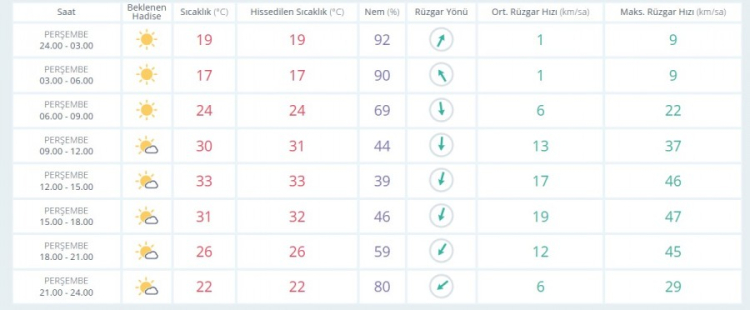 PERŞEMBE günü sıcaklık en düşük 17, en yüksek 33 derece az bulutlu