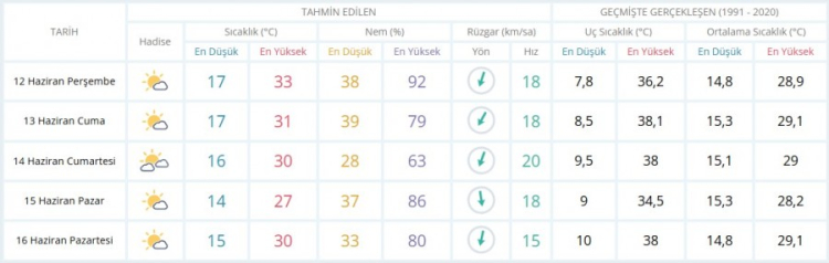 Meteoroloji Genel Müdürlüğü (MGM) tarafından Bursa için yapılan son değerlendirmelere göre 12 Haziran Perşembe günü ve 5 günlük hava durumu detayları şöyle;