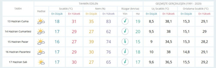 Meteoroloji Genel Müdürlüğü (MGM) tarafından Bursa için yapılan son değerlendirmelere göre 13 Haziran Cuma günü ve 5 günlük hava durumu detayları şöyle;