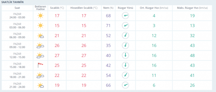 PAZAR günü sıcaklık en düşük 16, en yüksek 27 rüzgarlı
