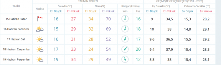 Meteoroloji Genel Müdürlüğü (MGM) tarafından Bursa için yapılan son değerlendirmelere göre 15 Haziran Pazar günü ve 5 günlük hava durumu detayları şöyle;