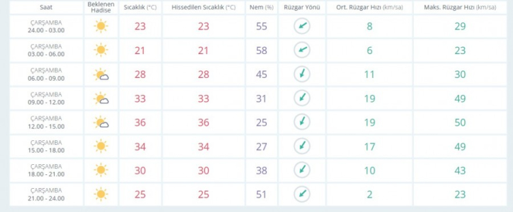 ÇARŞAMBA günü sıcaklık en düşük 21, en yüksek 36 derece az bulutlu