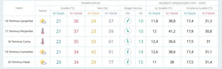 Meteoroloji Genel Müdürlüğü (MGM) tarafından Bursa için yapılan son değerlendirmelere göre 16 Temmuz Çarşamba günü ve 5 günlük hava durumu detayları şöyle;