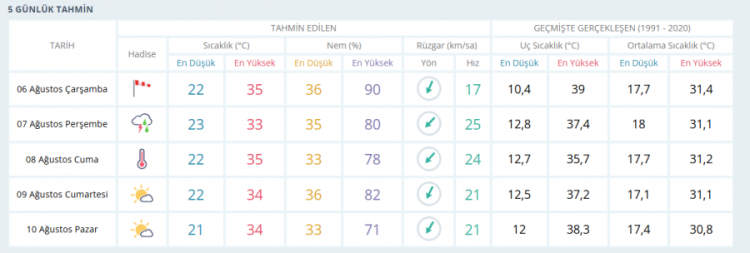 6 Ağustos Çarşamba günü sıcaklık, en yüksek 35, en düşük 22 derece. (RÜZGARLI)