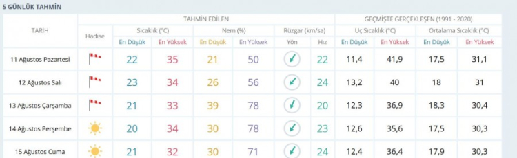 11 Ağustos Pazartesi günü sıcaklık, en yüksek 35 derece en düşük 22 derece.