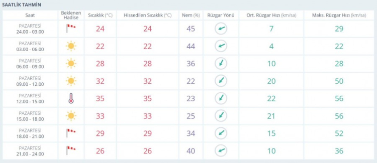 12 Ağustos Salı günü sıcaklık, en yüksek 34 derece en düşük 26 derece.