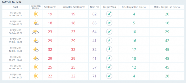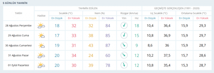 28 Ağustos Perşembe günü sıcaklık, en yüksek 32, en düşük 18 derece.