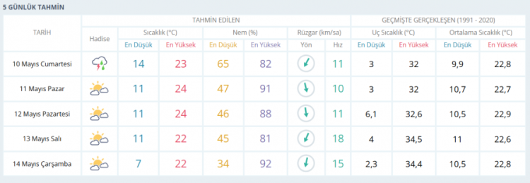 Meteoroloji Genel Müdürlüğü (MGM) tarafından Bursa için yapılan son değerlendirmelere göre 10 Mayıs Cumartesi günü ve 5 günlük hava durumu detayları şöyle;