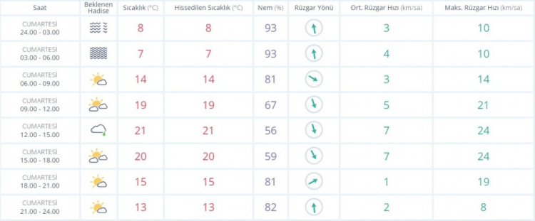 CUMARTESİ günü sıcaklık en düşük 8, en yüksek 21 derece hafif yağışlı