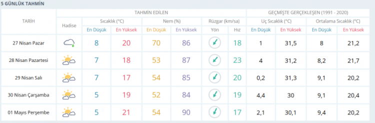 Meteoroloji Genel Müdürlüğü (MGM) tarafından Bursa için yapılan son değerlendirmelere göre 27 Nisan Pazar günü ve 5 günlük hava durumu detayları şöyle;