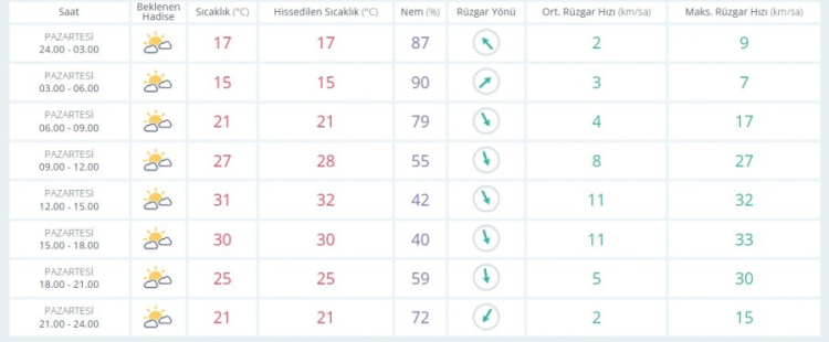 PAZARTESİ günü sıcaklık en düşük 17, en yüksek 30 derece parçalı bulutlu