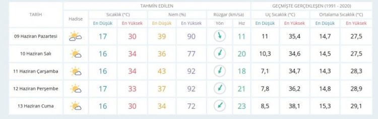 Meteoroloji Genel Müdürlüğü (MGM) tarafından Bursa için yapılan son değerlendirmelere göre 9 Haziran Pazartesi günü ve 5 günlük hava durumu detayları şöyle;