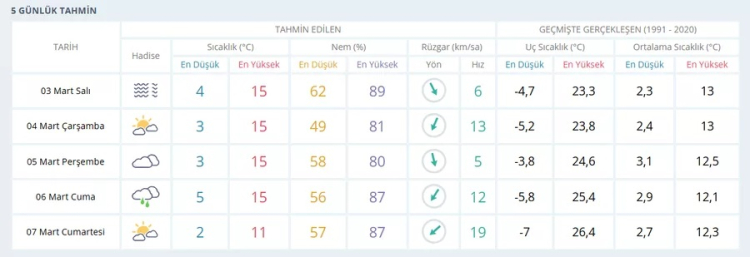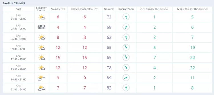 Çarşamba günü sıcaklıklar 3 ile 15 derece arasında seyredecek. Nem oranı yüzde 49-81 aralığında ölçülürken, rüzgar hızının 13 km/sa'ye kadar çıkması bekleniyor. Gün genelinde parçalı bulutlu bir hava tahmin ediliyor.