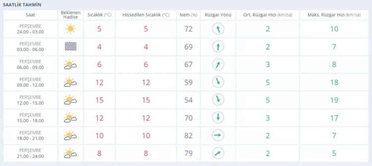 En düşük sıcaklık 4°C, en yüksek sıcaklık 15°C olacak. Nem oranı yüzde 54-81 arasında değişirken rüzgar saatte 4 km hızla esecek.