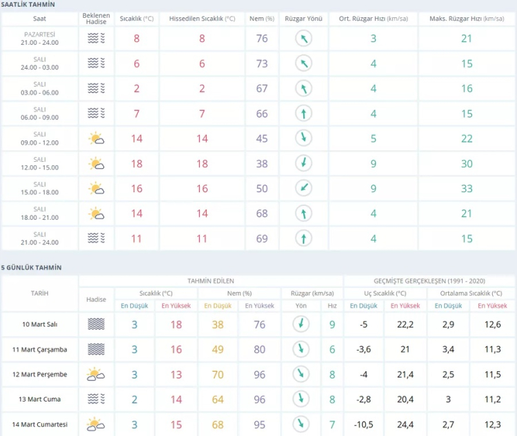 03.00 - 06.00: Günün en soğuk saatleri; sıcaklık 2°C.