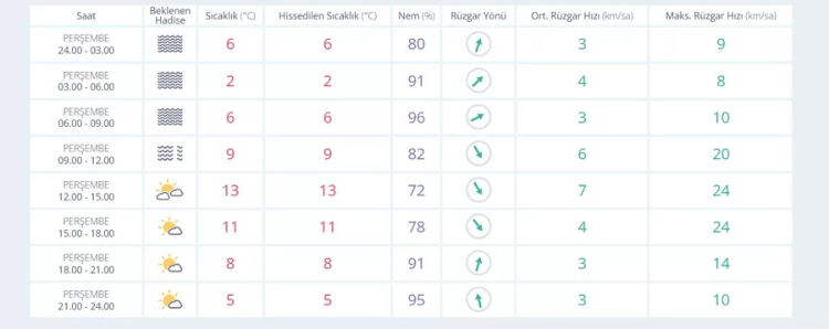 Saatlik tahminlere göre sabah saatlerinde sıcaklık 2 ila 6 derece arasında değişecek. Günün ilerleyen saatlerinde ise sıcaklığın yükselerek öğle saatlerinde 13 dereceye kadar çıkması öngörülüyor.