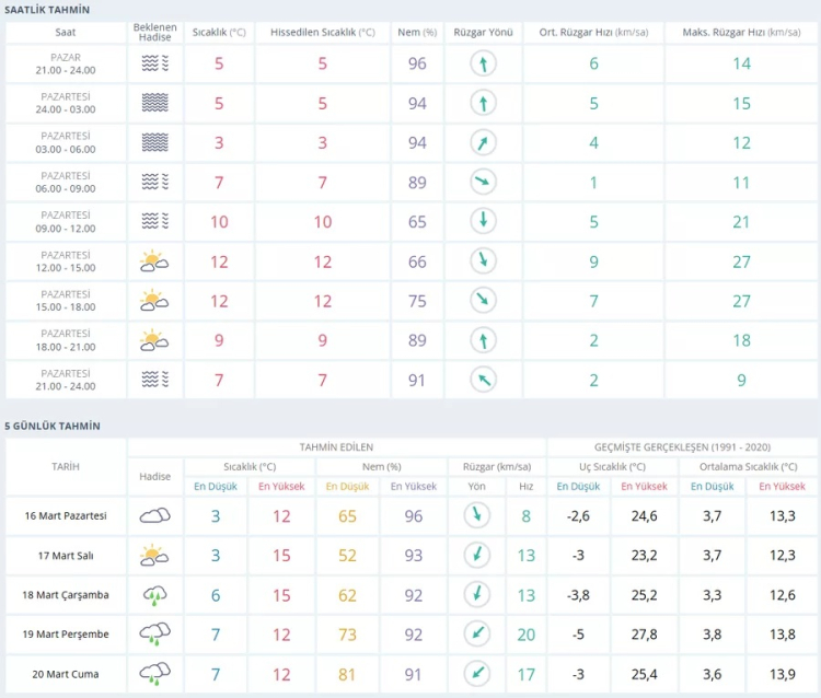 Öğleden sonra 15.00-18.00 saatleri arasında sıcaklık yine 12 derece civarında kalacak. Akşam saatlerine doğru sıcaklık yeniden düşerek 9 dereceye inecek. Gece saatlerinde ise sisin yeniden etkili olması ve sıcaklığın 7 derece civarında seyretmesi bekleniyor. Rüzgarın gün boyunca genellikle hafif eseceği tahmin ediliyor.
