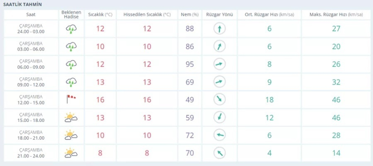 Yağışlar devam ediyor. Sıcaklıklar biraz daha düşerek 4°C ile 14°C arasında olacak. Nem oranı %47 - %74 seviyelerinde ölçülürken, rüzgarın hızı 13 km/sa olacak.