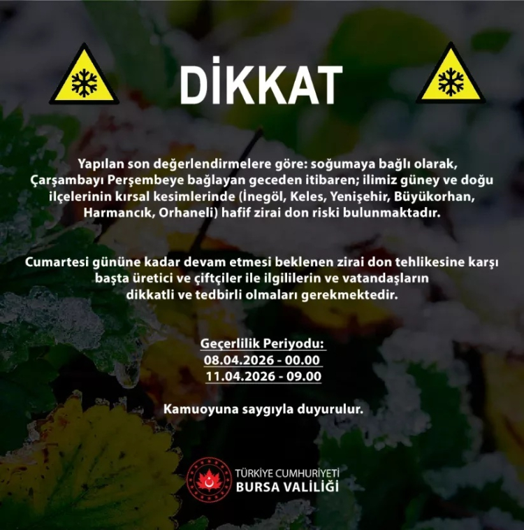 Bursa Valiliği tarafından yapılan son uyarıda Çarşambayı Perşembeye bağlayan geceden itibaren; ilimiz güney ve doğu ilçelerinin kırsal kesimlerinde (İnegöl, Keles, Yenişehir, Büyükorhan, Harmancık, Orhaneli) hafif zirai don riski bulunduğu bilgisi verildi.
