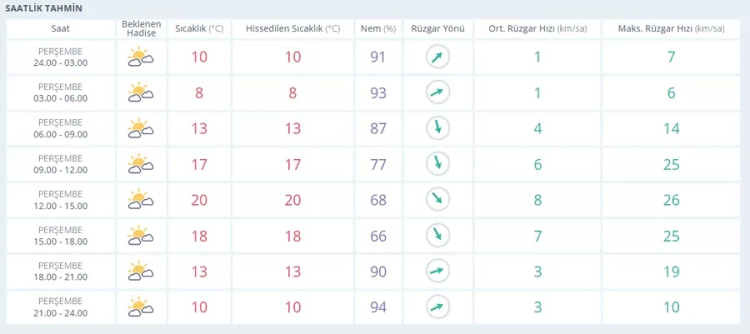 Parçalı bulutlu hava devam ediyor. Sabah saatlerinde serinlik hissedilirken gün içinde sıcaklık 21 dereceye kadar çıkıyor. Nem oranı %72-96 aralığında. Rüzgar hızında hafif artış bekleniyor.