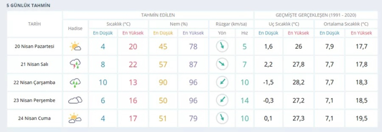 Hafta, yeniden parçalı bulutlu ve nispeten daha ılık bir havayla kapanıyor. Sıcaklık 4°C ile 17°C arasında. Nem %51-79 bandında, rüzgar ise orta şiddette (10 km/sa).