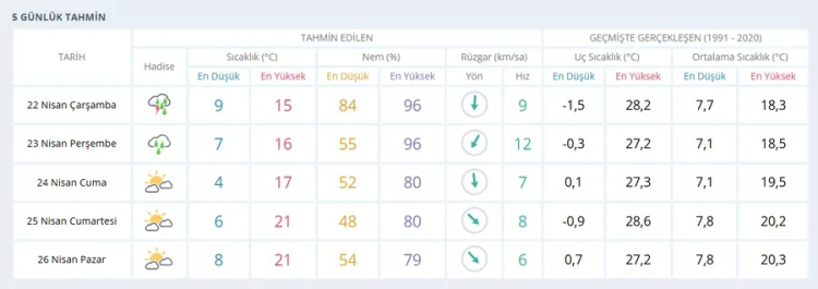 Sıcaklık: Gece saatlerinde termometreler 7°C'ye kadar gerilerken, gündüz en yüksek 16°C civarında olacak. Nem oranı ise gün içinde %55 ile %96 arasında geniş bir makas aralığında seyredecek.
